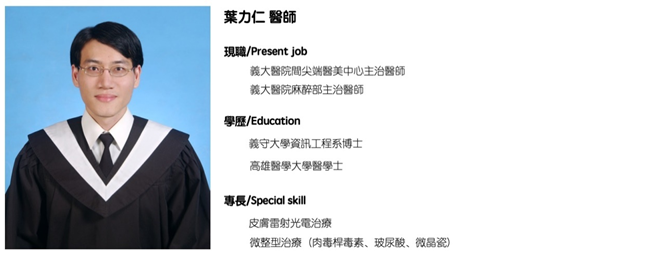 本中心設置於義大醫院本院五樓,擁有高雅且舒適的專屬空間,由頂尖專業的劉懿珊總監帶領醫療團隊,採用國內外最新穎的醫療級儀器設備,透過客製化醫美評估,量身訂製您的美麗。